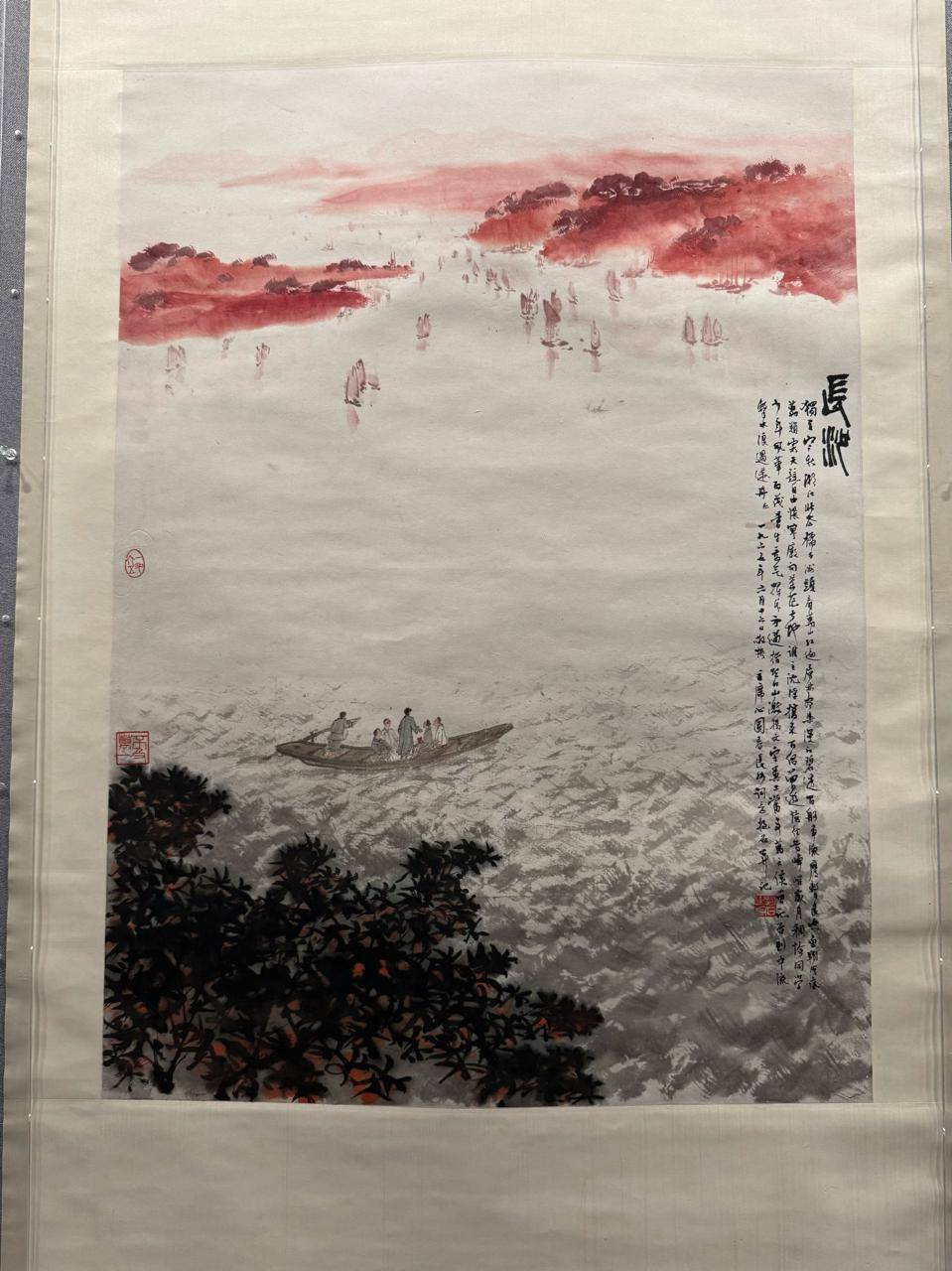 第四部分“换了人间”,聚焦两位艺术家1949年后的创作蜕变。齐白石晚年荣获“人民艺术家”称号,创作转向家国情怀,其《和平图》以简括构图、谐音寓意,寄托对和平的祈愿。傅抱石则更主动拥抱时代,不仅在国内外广泛开展写生创作,还首创“毛主席诗意画”并取得重大成就,其《词意图》以大笔挥写营造“万山红遍”的深秋意境,赋予山水画全新的内容与境界。